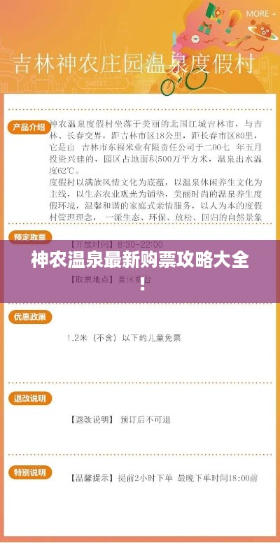 通过以上购票攻略,希望能够帮助你顺利购买神农温泉的门票,并享受一个愉快的温泉之旅,在游玩过程中,请注意安全、遵守规定,保护环境,留下美好的回忆。